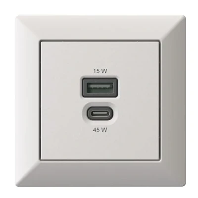 USB-C + USB-A flush-mounted insert with cover and frame matt white for all standard flush-mounted boxes diameter 65 mm with device screws (! ), Installation according to DIN 49073 Compatible with 55 switch ranges (frame inner dimensions 55 x 55 mm) white, RAL9010 (e.g. Busch Balance SI from Busch-Jaeger or standard 55 from Gira, etc.) 45 watt USB-C and 15 watt USB-A power delivery fast charging function, perfect as a charging station for laptops, tablets, smartwatches, and other small electronic devices with USB-C socket. Installation in the kitchen, living room, bedroom, hallway and more For connecting wires up to max. 2 x 2.5 mm² for easy further grinding even in multiple frames Variable power adjustment: USB-C (45W max.) 5V/3A for 15W, 9V/3A for 27W, 12V/3A for 6W, 15V/3A for 45W, 20V/2.25A for 45W // USB-A (15W max.) 5V/3A for 15W – To ensure maximum charging power, pay attention to the use of original/PD charging cable.