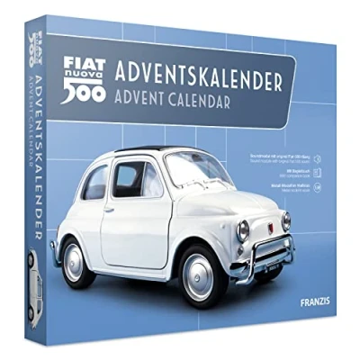 The complete package for all Fiat fans: in 24 steps to the Fiat 500 under the Christmas tree, according to the scale approx. 19 x 8 x 8.5 cm Detailed vehicle model: 5-piece kit with metal body for inserting and screwing, without gluing Loving details: 24 reversible boxes made of environmentally friendly cardboard create a large, attractive motif on the front and back and contain small surprises for the Fiat 500 fan Impressive effects: the integrated sound module with original engine sound makes the model vehicle come alive at the touch of a button Exclusive accessories: the licensed, large-format companion book contains numerous illustrations, exciting background knowledge, as well as instructions for creating the diorama, Manufacturer: FRANZIS Verlag GmbH