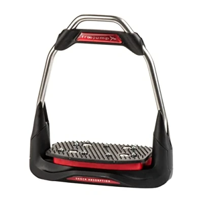 Comfort, Stability & Super Grip The Air'S stirrup offers a traditional design with a stainless steel frame. Its technical features, such as Freejump Shock Absorption technology and the option to choose the eye orientation and tread inclination, ensure exceptional comfort and perfect stability. The floor of the Air'S stirrup provides superior grip thanks to the super grip. The integration of fibreglass guarantees unparalleled longevity, and the removable steel studs enhance the anti-slip effect and ensure prolonged durability. Technology & Safety The floor of the Air'S stirrup incorporates Freejump Shock Absorption technology, with a combination of an elastomer sole and a mechanical joint for optimal shock absorption. This creates a true "air cushion" effect, ensuring exceptional comfort. The polyamide top banner of the Air'S stirrup is designed to detach under high pressure, allowing for quick foot release if necessary. This banner is easily replaceable. Adaptability to Rider's Needs The Air'S stirrup offers four technical options to best meet each rider's needs. The eye can be angled at 30° or straight, and the floor can be flat or inclined at 10°. The angled eye facilitates easy mounting thanks to its 30° orientation, while the straight eye, parallel to the floor, promotes inward orientation of the toe. The forward position of the main branch allows for an offset centre of gravity, facilitating a natural heel drop. Customisation & Distinction The Air'S stirrup is customisable for a unique look. It is possible to personalize the stickers, top banner, floor, and shock absorber by choosing from a range of colors and flags. The traditional structure of the Air'S stirrup allows for use in all disciplines, including dressage.