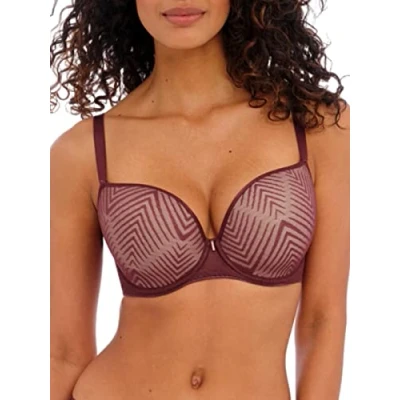 SIZE CONVERSION MADE EASY: Did you know Freya is sold in UK sizing? Please use the size chart to convert your US to UK size. To find your size, measure around the torso underneath the breast tissue to determine your band size. If measurement is an odd number, round up to the following even number. Measure around the fullest part of the bust to determine your bust size. To determine your cup size, subtract your band size from your bust size. Based on the Freya bestselling Cameo Molded Plunge T-Shirt Bra (AA3160). Molded cups for a smooth, rounded silhouette. Seam-free smooth finish under clothing. Stretch geo-lace outer cup. Fixed fully adjustable straps to prevent strap slippage. J Hook adjuster for racer back styling.