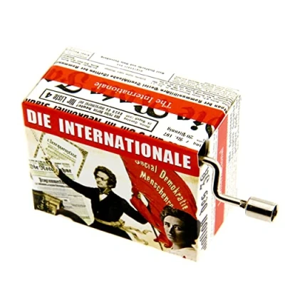 This music box is mounted on a wooden resonance board Melody: The Internationale Design of box: The Internationale, Manufacturer: Fridolin