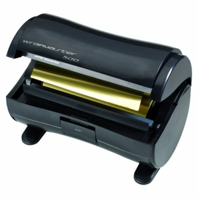Dispenser for aluminium foil hair Automatic folding Special foil-folding machine for cutting and pre-folding of hairdressing foil Cuts aluminium hair foil precise, clean and in a flash to the desired length and folds already at the cutting edge of the approach The cumbersome bending of the film by hand is thus eliminated