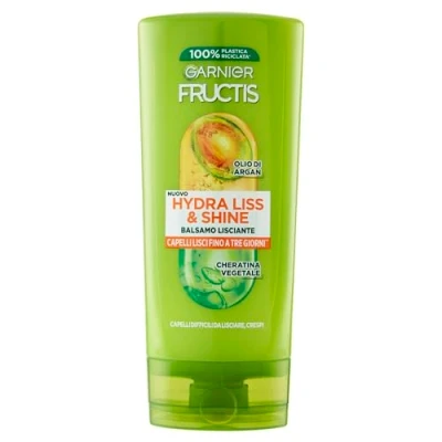 Smoothing conditioner ideal for difficult to smooth and frizzy hair, Softening action that gives shine to the hair, anti-frizz effect to tame unruly hair For straight hair for up to 3 days* without the use of straighteners, neat and bright hair without frizz *Instrumental test after applying shampoo and conditioner Apply to damp hair after Hydra Liss & Shine shampoo and destruct on lengths and ends, leave to act and rinse Formula enriched with Argan oil that softens the hair and gives an intense radiance, the vegetable keratin acts on the hair fibre eliminating frizz Contents: 1 x Garnier Fructis Smoothing Conditioner for Frizzy Hair, Luminous Effect, with Argan Oil and Vegetable Keratin, Hydra Liss & Shine, 200 ml