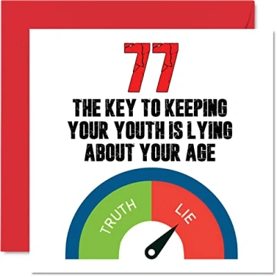 MAKE THEM SMILE WITH THIS FUN BIRTHDAY CARD: This exceptional quality birthday card for her or him shows the design "77 The key to to keeping your your is lying about your age". If you are looking for funny birthday cards for Woman, then then this happy birthday card is bound to make them laugh. Not just for friendship gifts for Woman this could also be for Best Friend, Work Colleague, Dad, Mum, Great Grandad, Grandpa, Nanny, Grandma, Colleague, Gran, Uncle, Auntie. WHAT DO YOU GET: The card is printed on one side and BLANK ON THE INSIDE to allow you to write your very own message. The unique fun design is printed on a specially sourced and environmentally responsible board. At 360 microns thick the natural white one-sided gloss board has a quality look and feel. Supplied with a coloured gummed envelope to complement the design and ready to be sealed and sent in the post. 77th birthday card for him, birthday card for Dad. NO INK SMUDGES: There is nothing worse than writing inside a card to find that the shiny surface makes the ink smudge. This is why we use a high quality one sided coated board. The uncoated side will absorb more of the ink from your pen to make smudging a thing of the past. Dad birthday cards, best friend birthday card, birthday card funny, rude birthday cards for Woman. SIZES: Greeting Card = 145mm x 145mm, Envelope = 155mm x 155mm, Card Thickness = 360 micron. Great friend birthday cards, male birthday card, 77th birthday card, happy birthday Mum cards, husband 77th birthday cards, stepdad birthday card. MADE AND QUALITY CHECKED IN THE UK: We print and manufacture all our product right her in the UK so you can be sure of a fast turnaround and a product that is expertly made. Using the very best Forest Stewardship Council certified board our card is conscious of the responsible management of the world's forests - 77th birthday cards for Men, Mens birthday cards, oldi card.