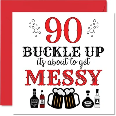 MAKE THEM SMILE WITH THIS FUN BIRTHDAY CARD: This exceptional quality birthday card for her or him shows the design "90 Buckle Up its about to get messy". If you are looking for funny birthday cards for Woman, then then this happy birthday card is bound to make them laugh. Not just for friendship gifts for Woman this could also be for Best Friend, Work Colleague, Great Grandad, Grandpa, Nanny, Grandma, Nan, Gran, Colleague, Granny, Dad, Mum. WHAT DO YOU GET: The card is printed on one side and BLANK ON THE INSIDE to allow you to write your very own message. The unique fun design is printed on a specially sourced and environmentally responsible board. At 360 microns thick the natural white one-sided gloss board has a quality look and feel. Supplied with a coloured gummed envelope to complement the design and ready to be sealed and sent in the post. 90th birthday card for him, birthday card for Great Grandad. NO INK SMUDGES: There is nothing worse than writing inside a card to find that the shiny surface makes the ink smudge. This is why we use a high quality one sided coated board. The uncoated side will absorb more of the ink from your pen to make smudging a thing of the past. Great Grandad birthday cards, best friend birthday card, birthday card funny, rude birthday cards for Woman. SIZES: Greeting Card = 145mm x 145mm, Envelope = 155mm x 155mm, Card Thickness = 360 micron. Great friend birthday cards, male birthday card, 90th birthday card, happy birthday Grandpa cards, husband 90th birthday cards, stepdad birthday card. MADE AND QUALITY CHECKED IN THE UK: We print and manufacture all our product right her in the UK so you can be sure of a fast turnaround and a product that is expertly made. Using the very best Forest Stewardship Council certified board our card is conscious of the responsible management of the world's forests - 90th birthday cards for Men, Mens birthday cards, oldi card.