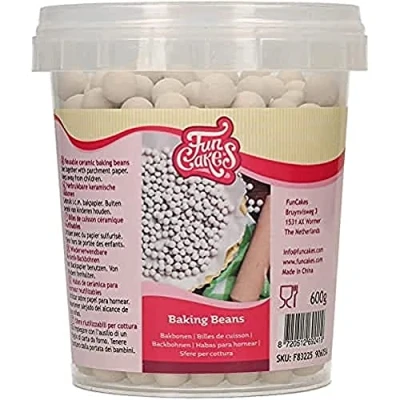 The ceramic baking beans from FunCakes can be used for blind baking dough. Blind baking a pie crust is necessary when it will be filled with an unbaked filling (like cream) or when the bake time of the filling is shorter than the crust. How to use baking beans: cover the baking pan with the batter, place a layer of parchment paper over the dough, place the beans on top and bake the cake. The FunCakes ceramic baking beans are reusable. Use them in combination with parchment paper. Content: 600 gram. FunCakes specialises in ingredients and cake decoration products; love baking as much as you do and are always on the lookout for professional bakery products.