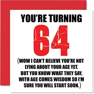 MAKE THEM SMILE WITH THIS FUN BIRTHDAY CARD: This exceptional quality birthday card shows the design "You're turning 64 wow i cant believe your not lying about your age yet. But you know what they say, with age comes wisdom so im sure you will start soon". If you are looking for fun birthday cards for Woman then this happy birthday card is bound to make them laugh. This could also be for Dad, Mum, Grandad, Nanny, Grandma, Gran, Uncle, Auntie, Cousin. WHAT DO YOU GET: The card is printed on one side and BLANK ON THE INSIDE to allow you to write your very own message. The unique fun design is printed on a specially sourced and environmentally responsible board. At 360 microns thick the natural white one-sided gloss board has a quality look and feel. Supplied with a coloured gummed envelope to complement the design and ready to be sealed and sent in the post. 64th birthday card for him, birthday card for Dad. NO INK SMUDGES: There is nothing worse than writing inside a card to find that the shiny surface makes the ink smudge. This is why we use a high quality one sided coated board. The uncoated side will absorb more of the ink from your pen to make smudging a thing of the past. Dad birthday cards, best friend birthday card, birthday card funny, rude birthday cards for Woman. SIZES: Greeting Card = 145mm x 145mm, Envelope = 155mm x 155mm, Card Thickness = 360 micron. Great friend birthday cards, male birthday card, 64th birthday card, happy birthday Mum cards, husband 64th birthday cards, stepdad birthday card, Sixty-Four Birthday Card, 40th birthday gifts for Men, 40th birthday gifts for Woman. MADE AND QUALITY CHECKED IN THE UK: We print and manufacture all our product right her in the UK so you can be sure of a fast turnaround and a product that is expertly made. Using the very best Forest Stewardship Council certified board our card is conscious of the responsible management of the world's forests - 64th birthday cards for Men, Mens birthday cards, oldi card.