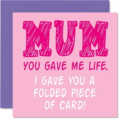MAKE THEM LAUGH WITH THIS FUNNY MOTHERS DAY CARD: This exceptional quality birthday card for her shows the design "Mum You Gave Me Life. I Gave You a Folded Piece of Card!". If you are looking for funny birthday greetings cards for Mum, then then this happy birthday card is bound to make them laugh. Not just for friendship gifts for women this could also be a birthday card for Mum, Mother, Mummy, Mom, Mama, Mama, or Mommy. WHAT DO YOU GET: The card is printed on one side and BLANK ON THE INSIDE to allow you to write your very own message. The unique fun design is printed on a specially sourced and environmentally responsible board. At 360 microns thick the natural white one-sided gloss board has a quality look and feel. Supplied with a coloured gummed envelope to complement the design and ready to be sealed and sent in the post. Gifts for Mum Mothers Day, Mum card. NO INK SMUDGES: There is nothing worse than writing inside a card to find that the shiny surface makes the ink smudge. This is why we use a high quality one sided coated board. The uncoated side will absorb more of the ink from your pen to make smudging a thing of the past. Happy birthday Mum cards, Mam birthday card, Mom birthday cards. Mother’s Day card for Mum, Mothers Day card funny rude. SIZES: Greeting Card = 145mm x 145mm, Envelope = 155mm x 155mm, Card Thickness = 360 micron. Great Mum birthday cards from Son or Daughter. Mum birthday cards from Daughter, birthday cards for Mum, Mother birthday card, Mum birthday cards from Son, Mum cards birthday, Mum 50th birthday card, birthday card Mum from Daughter, Mothers Day card funny cheeky, Mama Mothers Day card, funny Mothers Day cards. MADE AND QUALITY CHECKED IN THE UK: We print and manufacture all our product right her in the UK so you can be sure of a fast turnaround and a product that is expertly made. Using the very best Forest Stewardship Council certified board our card is conscious of the responsible management of the world's forests - Mothers Day funny card, happy Mothers Day gifts.