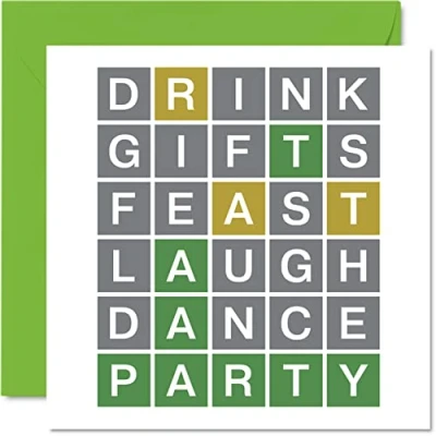 MAKE THEM LAUGH WITH THIS FUNNY BIRTHDAY CARD: This exceptional quality birthday card for her or him shows the wordle quiz design saying "Drink Gifts Feast Laugh Dance Party". If you are looking for funny birthday cards for women, then then this happy birthday card is bound to make them laugh. Not just for friendship gifts for women this could also be for Best Friend, Work Colleague, Mum, Grandma, Nan, Dad, Grandad, Nanny, Colleague, Brother, Sister, Cousin, Auntie or Uncle. WHAT DO YOU GET: The card is printed on one side and BLANK ON THE INSIDE to allow you to write your very own message. The unique fun design is printed on a specially sourced and environmentally responsible board. At 360 microns thick the natural white one-sided gloss board has a quality look and feel. Supplied with a coloured gummed envelope to complement the design and ready to be sealed and sent in the post. NO INK SMUDGES: There is nothing worse than writing inside a card to find that the shiny surface makes the ink smudge. This is why we use a high quality one sided coated board. The uncoated side will absorb more of the ink from your pen to make smudging a thing of the past. Dad birthday cards, best friend birthday card, birthday card funny, rude birthday cards for women. SIZES: Greeting Card = 145mm x 145mm, Envelope = 155mm x 155mm, Card Thickness = 360 micron. Great friend birthday cards, male birthday card, 30th birthday card, happy birthday Dad cards, husband 50th birthday cards, stepdad birthday card, 40th birthday card for him, birthday card for Dad. Uncle birthday card, Aunty birthday card. MADE AND QUALITY CHECKED IN THE UK: We print and manufacture all our product right her in the UK so you can be sure of a fast turnaround and a product that is expertly made. Using environmentally responsible premium board our card is conscious of the responsible management of the world's forests - 40th birthday cards for men, mens birthday cards, oldi card.