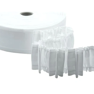The most popular webbing has pockets for hooks and ropes to loop automatically and evenly, you can also insert the hooks into the pockets in multiple positions It is a polyester tape, it comes as a webbing with pockets to insert the trumpet hooks and has two draw threads for curling The strip is packed in rolls of 50 meters, easy to use because it is well resinated and rigid, it can be machine washed at 40°C (40°C) and ironed without problem. Remains unchanged over time It is available in white or transparent (for lighter curtains such as organza) and two, three or four cords (for heavier curtains) in heights from 30 mm to 170 mm. This is the 65mm high white version