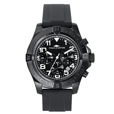 Stainless steel watch with chronograph function and black silicone strap. Fynch-Hatton. Stainless steel case IP black brushed Ø 45 mm; scratch-resistant mineral glass, water resistance: 5 ATM, clasp: pin buckle Packaged in a high-quality, versatile canvas bag The Fynch-Hatton men's jewellery and watch collection impresses with its individual and timeless design in high quality. The perfect gift idea for any man.