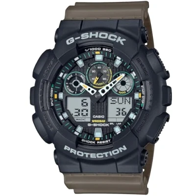 Utilitarian practicality, savvy style — all with G-SHOCK functionality and toughness. This Analogue-Digital watch has a calendar function: Day-Date as well as Stop Watch , Countdown , Worldtime , Alarm and Light High quality 21 cm length and 28 mm width Brown Plastic strap with a Buckle Case diameter: 50 mm,case thickness: 14 mm, case colour: Black and dial colour: Black Water resistant: 20 bars-Weight: 70 g The watch is delivered in an original gift box and has a warranty of 2 years