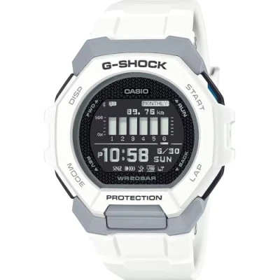 Introducing the GBD-300 line for your active everyday — the tough, sports-oriented G-SQUAD designed to make training fun. This Digital watch has a calendar function: Day-Date as well as Bluetooth , Stop Watch , Dual Time , Countdown and Alarm High quality 21 cm length and 22 mm width White Plastic strap with a Buckle Case diameter: 46 mm,case thickness: 13 mm, case colour: White and dial colour: Black Water resistant: 20 bars-Weight: 58 g The watch is delivered in an original gift box and has a warranty of 2 years