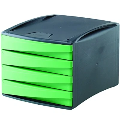 Perfect to organize your desktop space Dark grey shell with coloured drawers 4 drawers (height: 50mm - internally: 45mm) Green2Desk letter tray can stacked on top to utilize space Matching items available