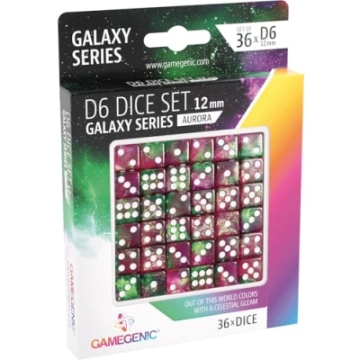 SET of 36 D6 DICE: You can never have too many dice! This set contains 36 six-sided dice of 12 mm size, making it suitable for dice games, board games, card games and roleplaying games that use D6 dice. GALAXY SERIES: These Galaxy Dice feature the exciting fusion of two or more cosmic colors, creating unique looks with the addition of glittering elements. AURORA DICE: Each die in the set comes in a captivating green and purple color with shining effects and glittering elements, making it a stunning accessory to use with any of your favorite dice games. PREMIUM QUALITY: Dice are constructed from premium quality resin, and have smooth round edges. USE WITH OTHER GAMEGENIC PRODUCTS: Check out Gamegenic playmats, card sleeves, deck boxes and gaming accessories for even more ways to customize, organize and store your games., Manufacturer: Asmodee