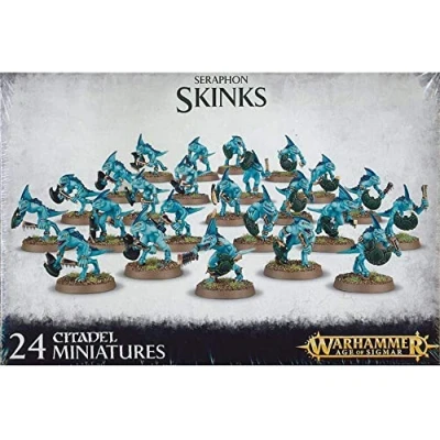 Seraphon Skinks This multi-part plastic kit gives you the components needed to assemble twenty-four Skinks. This kit comes supplied unpainted and requires assembly - we recommend using Citadel Plastic Glue and Citadel Paints. plastic miniatures, Manufacturer: GAMES WORKSHOP