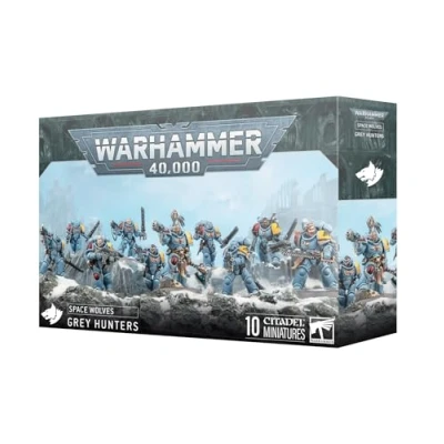 Games Workshop - Warhammer 40,000 - Space Wolves: Grey Hunters 10 plastic miniatures for Warhammer 40,000 - Easy to personalise with a choice of heads, interchangeable weapons, and other cosmetic options Dominate mid-range firefights before charging in and finishing off survivors with your chainswords Add tempered, yet ferocious, warriors to your Space Wolves army Plastic Model Kit, Manufacturer: Games Workshop