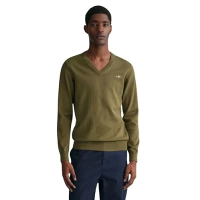 Our Gant men's V-neck cotton pullover has a regular fit An embroidered Gant crest graphic on the chest Ribbed cuffs on the hem and cuffs