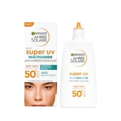 Garnier Ambre Solaire Super UV Niacinamide Daily Fluid Sun Protection for Blemish Prone Skin, Very High with SPF 50+, Invisible Finish, 1 x 40 ml