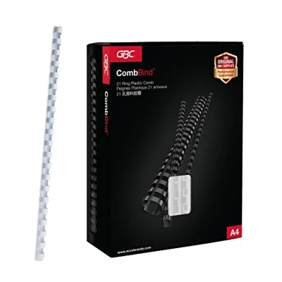 Ideal for creating training manuals, presentations and internal reports, bind up to 390 sheets of paper (780 pages), compatible with all 21 ring CombBind systems 45 mm comb diameter, accurate A4 length and hole spacing for perfect alignment with A4 paper for a professional finish Flexible and robust construction for quick and easy de-binding and re-binding of documents, comb bind spines allow the document to lay flat making page turning, note taking and photocopying easy High quality, PVC resins ensure that GBC combs won’t chip, scratch, peel or discolour and can be re-used Contents: 50 x GBC CombBind Binding Combs, 45 mm, 390 Sheet Capacity, A4, White, 1.087 kg, 4028206