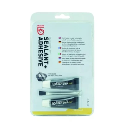 Gear Aid Seam Grip WP is a tent seam sealer that goes above and beyond to keep moisture out. Seal up to 180 cm of tent, tarp, and awning seams with this mulitpack consisting of 2 7g tubes. As a permanent waterproof sealant, it keeps outdoor enthusiasts dry and comfortable. It’s also a flexible repair adhesive that can patch up holes in all types of fabric including vinyl, nylon and canvas. This makes Seam Grip WP suitable for repairing small holes in your expensive shell, puff or sleeping bag. So, take this clear glue along on the next camping trip, and be ready when gear rips, leaks or falls apart. Seam Grip WP Sealant and Adhesive saves gear and the adventure. Seam Grip WP is suitable for PU coated tent cloth. For silicone-coated nylon or silnylon cloth, use Seam Grip Sil Silicone Tent Sealant.