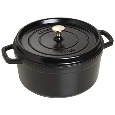 Round roaster made of enamelled cast iron with a 5 litre volume, Ideal for browning, slow cooking and stylish serving of meat, fish, fruit or vegetables Energy-saving cooking in the oven and on all types of cookers including induction, Juicy and tender result due to special drop structure in the lid, Long-lasting temperature storage for cold and hot food Practical and tasteful design: Handy, ergonomic handles, Metal lid knob heat-resistant up to 250°C, Vivid colours, Highlighted lettering Made in France: Uniquely handmade, Scratch-resistant and durable thanks to interior enamel, Acid-resistant, Taste neutral, Easy hand wash, Dishwasher safe Contents: 1x STAUB roaster, Dimensions with lid + handles (LxH): 32.7 x 16.7 cm, Diameter: 26 cm, Base diameter: 21.7 cm, Volume: 5 L, Weight: 5.7 kg, Colour: Black, 40509-310-0