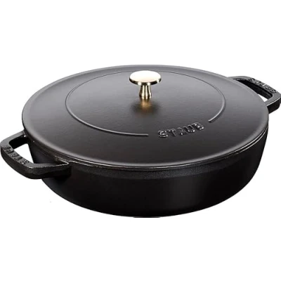 Shallow cooking pot with Staub's unique Chistera drop structure lid for moisture retention, Enamelled cast iron, 1 litre volume, Ideal for browning, slow cooking and stylishly serving meat, fish, fruit or vegetables Energy-saving cooking in the oven and on all types of cookers including induction, Juicy and tender result due to special drop structure in the lid, Long-lasting temperature storage for cold and hot food Practical and tasteful design: Handy, ergonomic handles, Lid knob heat-resistant up to 250°C, Chistera Drop Structure for even distribution of condensation during cooking Made in France: Uniquely handmade, Scratch-resistant and durable thanks to interior enamel, Acid-resistant, Taste neutral, Easy hand wash, Dishwasher safe Contents: 1x STAUB roaster, Dimensions with lid + handles (LxH): 36.1 x 12.6 cm, Diameter: 28 cm, Base diameter: 22.2 cm, Volume: 3.7 L, Weight: 5.4 kg, Colour: Black, 40511-472-0, Weight: 12.56 Pounds, Manufacturer: STAUB