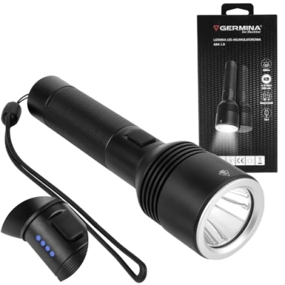 Linterno LED Germina a batería con modos de iluminación y zoom Fuente de luz: 1*OSRAM P9 Batería: 1*18650 2600mAh (incluida) Luminous flujo: 1000lm Protection grade: IP44 Funciones: high-medium-bajo-flash-SOS Material: Aluminum USB cable: Type C Size: 4.5x16.4 [cm] ¡Una linterno perfecta para el uso diario, pero también para acampar y viajar! Es ligero y compacto