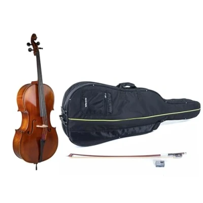 High-quality materials: The GEWA cello set Allegro VC1 impresses with a solid European maple back and sides and a solid spruce top, which ensures a warm and balanced sound. Elegant finish: the cello is finished with a brown-amber natural resin varnish in an antique style, giving the instrument a classic and attractive look. The hand-painting process results in slight colour variations, giving each cello an individual touch. Careful workmanship: the incorporated chip, the ebony set and the prepared original Aubert bridge ensure a solid construction and precise sound characteristics that make playing a pleasure. Tone-stable strings: Equipped with Larsen Aurora strings and a Wittner fine-tuning tailpiece, this cello offers excellent tuning control and sound stability that will delight even advanced players. Complete set for beginners: the ready-to-play set includes a practical cello bag with a pocket for the bow and strings and rucksack straps. You can also choose between a Massaranduba or carbon bow with natural hair to optimise your playing experience. Contents: Cello 1/4, cello bag, Massaranduba bow