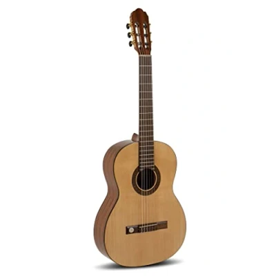 4/4 concert guitar from 14 years 650 mm scale, 52 mm nut width, 980 mm total length Solid 2-piece spruce top, real wood mosaic soundhole rosette, mahogany back and sides Tinted maple neck, fingerboard and bridge: acacia or bubinga subject to availability, side fingerboard marking on the 3rd, 5th and 7th Waistband Triple ceiling edge, 1x bottom edge, gold-plated mechanism with lyre, black buttons and waves Environmentally friendly polyurethane high-gloss finish, HANNABACH strings, made in Europe