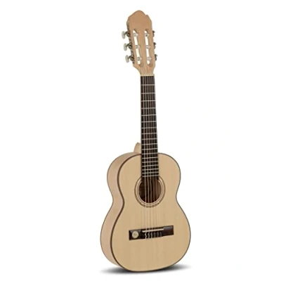 1/2 size, for ages: approx. 7-9 years, 530mm scale, 45mm nut width, 835mm total length Solid spruce top, maple neck, acacia fingerboard and bridge Triple wooden ceiling edge, 1-fold wooden floor edge, chrome-plated mechanism with lyra and acrylic buttons, satin finish, made in Europe, back and sides maple, headstock rest maple