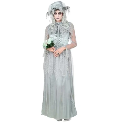 This ghost bride costume from Widmann is the key to the realm of the undead A floor-length grey dress decorated with lace and a button placket. It also has sleeves made of grey tulle. Furthermore, a grey hat is included, this is also decorated with grey lace The costume is available in size S. With the matching accessories, for example a bridal bouquet, you can complement it perfectly With this outfit you will be the eye-catcher at any Halloween party and scare some party guests More beautiful costumes and accessories can be found in our brand shop. Click on the brand name Widmann below the product title, Manufacturer: Widmann