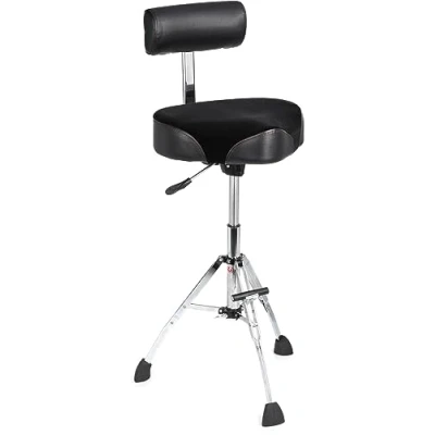 Pneumatic Height Adjustment With an intuitive adjusting lever, you can freely adjust the seat height between 24" and 30", which allows precise adjustment to suit your needs. COMFORTABLE VINYL SADDLE The 42cm vinyl saddle with an impressive 9cm padding provides exceptional seating comfort and durability. The cut-outs for the thighs ensure lasting comfortable sitting. ERGONOMIC BACKREST The adjustable backrest of the drum stool supports the spine, promotes a healthy sitting posture and reduces fatigue during long music sessions. HEAVY DUTY CONSTRUCTION With an amazing load capacity of up to 115kg and a sturdy double-braced base fitted with exclusive "Superfoot" rubber feet, this stool offers outstanding stability and slip resistance. Box contents: Gibraltar 9808HMTB performance stool, drum stool, height-adjustable 16 inch round bar stool, with backrest and footrest, ultimate seating comfort and stability, for studio, stage and office.