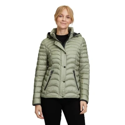 Slightly fitted women's quilted jacket from Gil Bret for a modern silhouette 65cm overall length and removable hood for versatile style Stand-up collar gives the jacket a contemporary touch Practical zip pockets provide stylish storage space Sporty style and plain pattern make the jacket a versatile companion