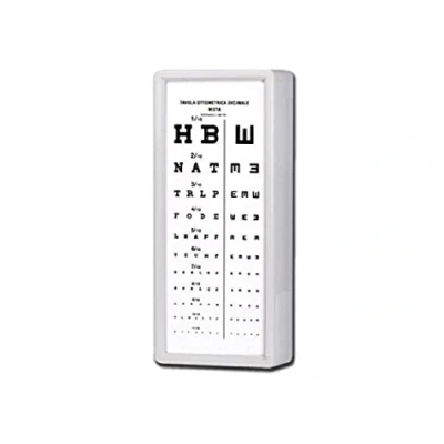 Viewing Area: 24 x 61 cm External dimensions: 29 x 66 x 3.8 cm Optometric chart Mixed Decimal 5m printed on lacquered MDF Structure in aluminum oven epoxy powder painted color RAL7037 Weight: 2 Kg