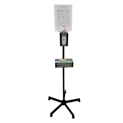 Gel dispenser and glove box stand, strong and durable black epoxy coated steel stand It can be positioned in any room, shop, treatment room, commercial room, office to provide customers and patients with the disinfectant and disposable gloves. Comes with disassembled base and 5 feet, gel dispenser carrier and glove box carrier included. The gel and gloves are not included. Sizes: Total height: 157 cm; Height of the base of the gel rack: 112 cm; Gel carrier sizes: base 10 x 10 cm, height 15 cm; glove box holder height: 84 cm. Base diameter: 60 cm