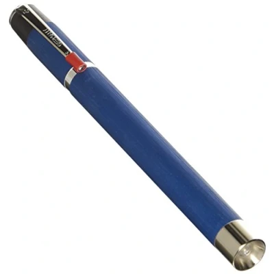 Diagnostic medical Penlight for oral inspection. Made in Germany. LED light. 100,000 hours lifetime. Supplied with 2 AAA batteries Made of Anodized Aluminium, Blue Colour ON/OFF by Pocket Clip. Medical Device Certified: Class I