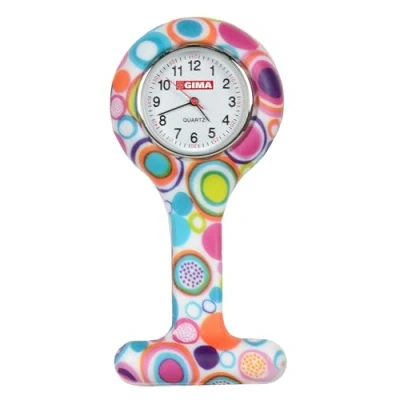 Silicone nurse watch provided with a safety pin. Round dial. Bubble pattern. Suitable to measure patient pulse, beat and sterilization procedure timing. Conforming to procedures not allowing nurses to wear wrist watches. Japan movement; Watch case size 35 mm; Watch length 85 mm; Shelf life of battery: 18 months from first use. Manual: English, French, Italian, Spanish, Portuguese, German, Greek, Polish, Arabic.