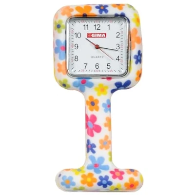 Silicone nurse watch provided with a safety pin. Square dial. Flowers pattern. Suitable to measure patient pulse, beat and sterilization procedure timing. Conforming to procedures not allowing nurses to wear wrist watches. Japan movement; Watch case size 35 mm; Watch length 85 mm; Shelf life of battery: 18 months from first use. Manual: English, French, Italian, Spanish, Portuguese, German, Greek, Polish, Arabic.