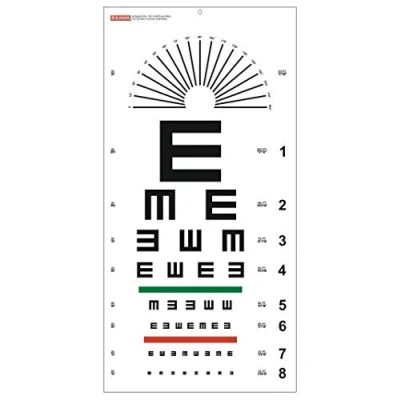 Tumbling "E" Eye Chart. Non-reflecting, matte finish eye charts Designed for vision testing at 20 foot distance Eye chart measures 28 X 56 cm (11 x 22 in.) The Tumbling "E" vision chart is great for use with patients that are not familiar with the Roman alphabet These patients simply have to gesture the direction they see the optotype since there is only one This optotype is place in four different directions; up, down, left, and right. The Tumbling "E" chart is considered highly reliable and accurate. It is great for the detection of Astigmatism.