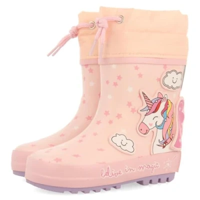 Pink Wellington Boots with Unicorn Patch They feature adjustable nylon collar and 100% polyester padded lining and insole The sole is made of natural rubber and is durable, waterproof and non-slip Water Resistant