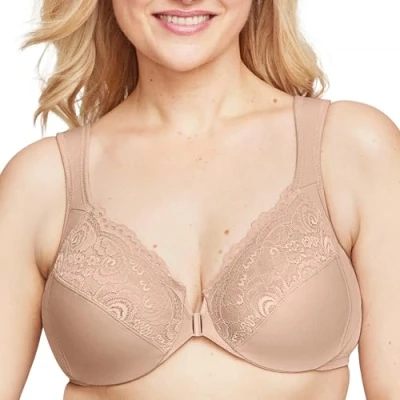 WONDERWIRE TECHNOLOGY: A padded underwire adds an extra layer of cushion to prevent wire poke. POSTURE BACK: Crisscrossed design pulls your shoulders back to improve your posture. FRONT CLOSURE: Easy on and off secure front closure. SUPPORT: Lace-topped cups feature side-bust control to shape and support. DESIGNED IN NEW YORK SINCE 1921: We have over 100 years experience crafting bras for curvy women. Closure: Snap Front Close Strap Type: Adjustable Wide Cushioned Shoulder Straps Back Style: Posture Back Support Level: Medium Features: Cushioned Wire, Stretch Lace Cups, Moisture Wicking, Posture Back, Side Smoothing SHape Enhancer, Underwired