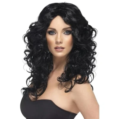 Long and curly wig in black for women, for a charming fancy dress Authentic Smiffy's Party Supplies Quality guaranteed! For a glamorous look, hand wash and air dry only, 100% polyester Box contents: 1 Smiffys women's long and curly wig with fringe in robust plastic box, wig, does not include: top, colour: black, size: one size, Manufacturer: Smiffys