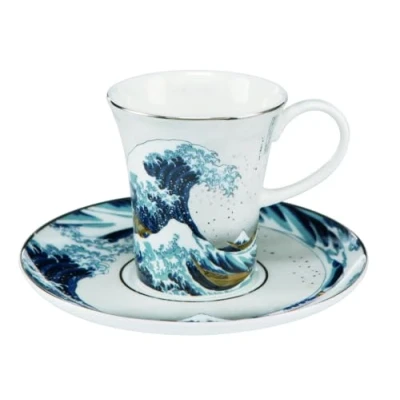 Very beautiful espresso cup with saucer from the Goebel brand from the Hokusai collection The set is made of fine bone china in several colours with the motif The Wave II The Welle II Hokusai espresso cup became famous especially for its series of pictures "36 Views of Mount Fuji" To preserve the brilliance of the colours and the gold plating, washing by hand with mild detergent is recommended Dimensions: 12 cm x 12 cm x 7.5 cm