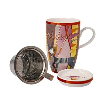 Very beautiful tea cup with lid and strainer from the Goebel brand from the Rosina Wachtmeister collection The mug is made of fine bone china in several colours with the motif Sottosopra A rhythmic alternation of strokes, dots and shades, in combination with their distinctive cat representations, form a unique unity To preserve the brilliance of the colours, washing by hand with mild detergent is recommended Dimensions: 11.5 cm x 8 cm x 14 cm