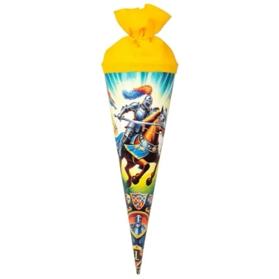 goldbuch Sibling bag knight heroes made of reinforced lacquer cardboard with a knight on a horse as a motif for the perfect start to school Ideal as a gift for school enrolment, for starting studies or teaching, for starting work, for retirement as well as ideal as gift wrapping, costume accessory or joke gift Safely stored contents thanks to colour-coordinated felt closure, easy opening and closing of the felt closure, smooth surface The sugar bag offers plenty of space for treats and useful school accessories such as pens, pencil cases, craft utensils, small writing pads and homework books goldbuch Gift bag knight heroes, motif: knight, length: 35 cm, diameter: 11.5 cm, school cone with yellow felt closure, item no. : 93158, EAN: 4009835931585, Manufacturer: Goldbuch Georg Brückner GmbH