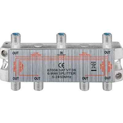 F sockets Screening 100 dB for digital signals DC-pass at all ports Insertion loss at 1750 MHz: 14 dB Return loss at 1750 MHz: 14 dB 6-way satellite F splitter to split satellite signals 5-2500 MHz Seven F sockets, one F coax IN six F coax OUT for connecting standard sat cables Screening 100dB for digital signals; DC-pass at all ports; insertion loss at 1750 MHz: 14 dB; return loss at 1750 MHz: 10 dB