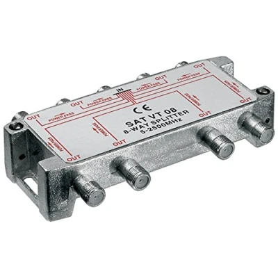 F sockets Screening 100 dB for digital signals DC-pass at all ports Insertion loss at 1750 MHz: 15 dB Return loss at 1750 MHz: 14 dB 8-way satellite F splitter to split satellite signals 5-2500 MHz Nine F sockets, one F coax IN eight F coax OUT for connecting standard sat cables Screening 100dB for digital signals; DC-pass at all ports; insertion loss at 1750 MHz: 15 dB; return loss at 1750 MHz: 10 dB