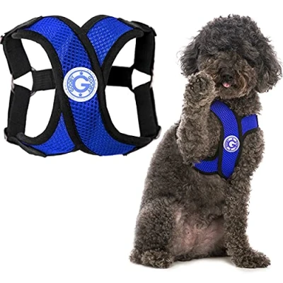 DOG HARNESSES FOR SMALL DOGS ? Gooby?s Comfort X Step-In Harness is made for small breed dogs. This means that our largest size will fit a dog up to 30 lbs. In order to fully utilize the functionality of the harness, as well as the fit, we recommend measuring the largest part of the dog?s chest. If the measurement is between sizes, please size up. EASY-ON. EASY-OFF ? Our Step In Dog Harness design makes it easy for your dog to step in to the harness and out without a hassle. Simply place the left paw of the dog on the left arm hole, and right paw of the dog on the right arm hole and pull up to fasten. PATENTED DESIGN ? Our patented no choke dog harness X frame (US D798,508 S) sits below the neck and distributes the pull around the chest. International products have separate terms, are sold from abroad and may differ from local products, including fit, age ratings, and language of product, labeling or instructions.