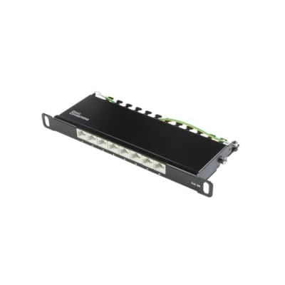Patch panel / patch panel / distribution panel - 10 inch / 10 inch version with 8 ports Cat. 6A / Category 6A - Suitable for 10 Gigabit/s Ethernet and for transmission frequencies up to 500 MHz. Shielded (STP) + complete shielding of the RJ45 jacks and the LSA strips + central earth connection Cable installation via LSA strips (colour coding according to TIA 568 A/B) - for solid and stranded cables (22-26 AWG) Product colour: Jet black (RAL9005) / Dimensions (WxDxH): 254 x 100 x 22 mm